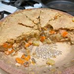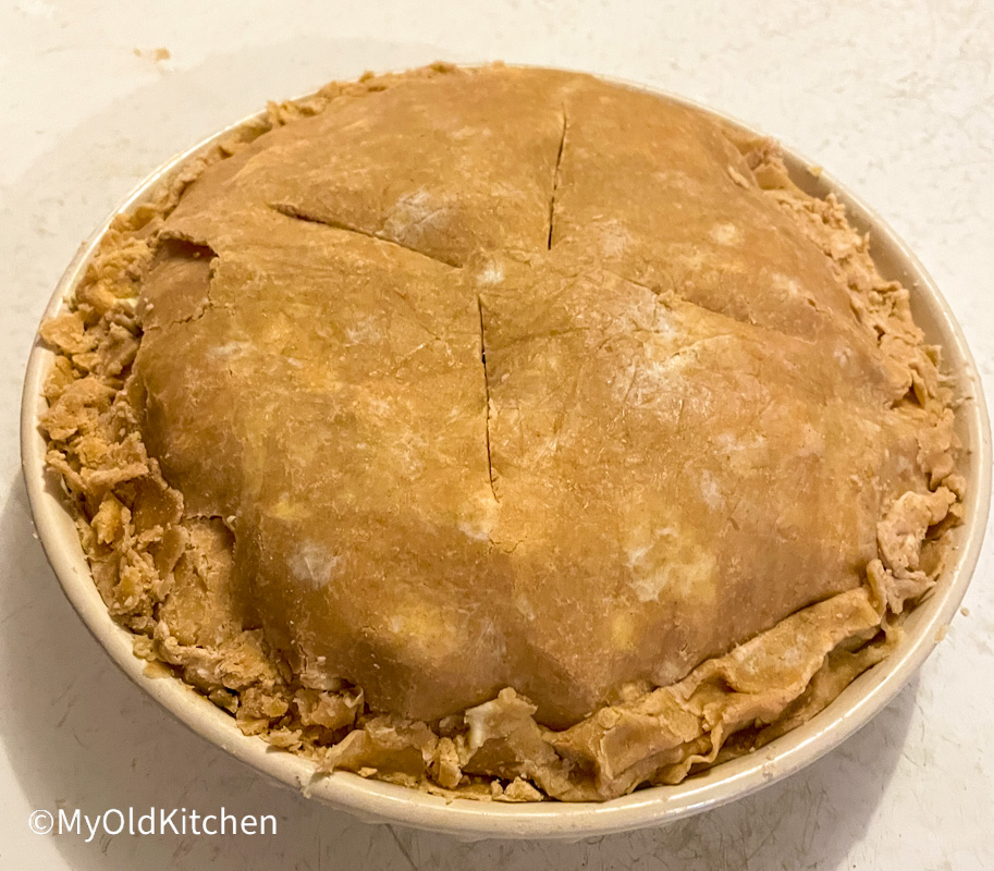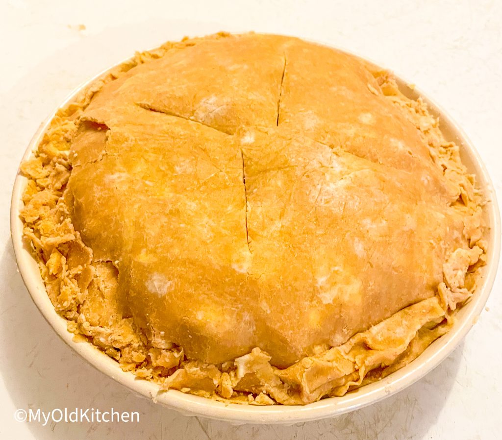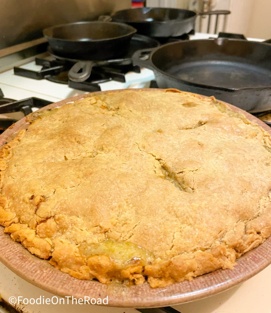 This works best at about 350F but do test your oven to make sure it’s accurate at that temperature. Place a large baking sheet on the rack beneath the pie (not directly under the pie pan) to catch any overflow of filling during baking. Ours has a lot of filling and usually we like it softer textured, so it usually cooks 45-60 minutes depending on how cooked you would like the filling and how golden brown the top.