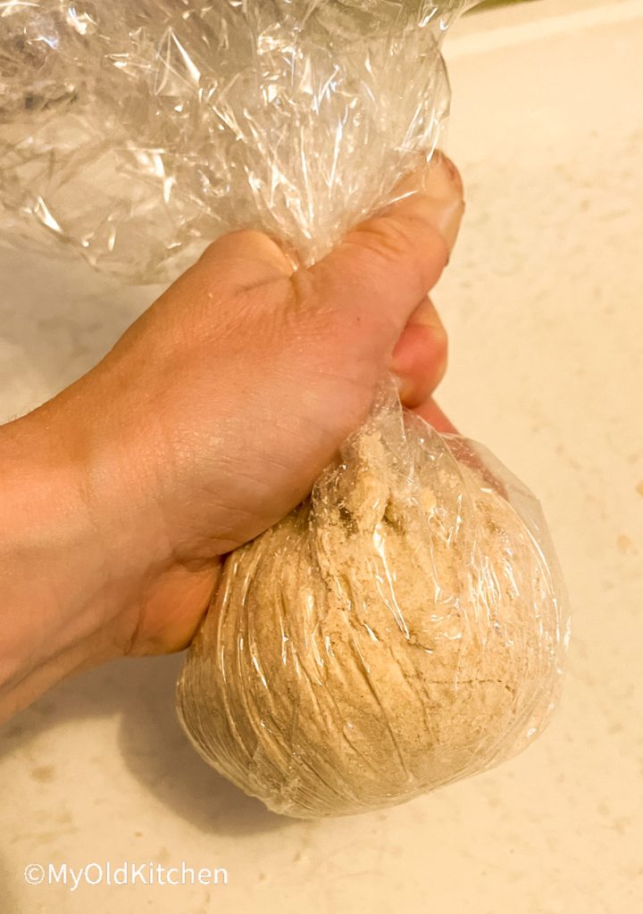 - Lay two large pieces on the rolling surface and place half the crust mixture in the middle. Bring the edges of the plastic wrap up to form a bag, and twist it tightly around the crust mixture until you get a tight packed little ball of crust dough.