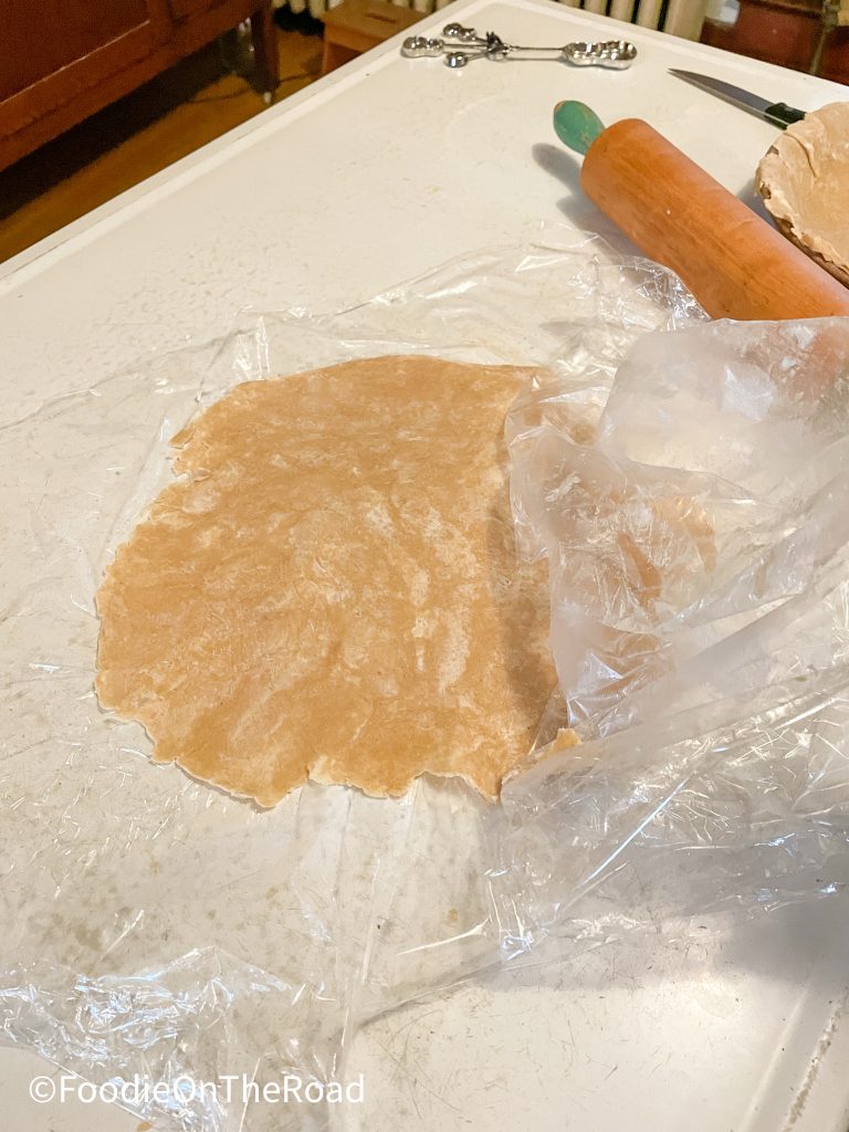 Everyone has a different method for rolling out pie crust, but here’s our secret: plastic wrap. Lay two large pieces on the rolling surface–like my antique enamel top table–and place half the crust mixture in the middle. It’s going to be very crumbly. Bring the edges of the plastic wrap up to form a bag, and twist it tightly around the crust mixture until you get a tight packed little ball of crust dough.