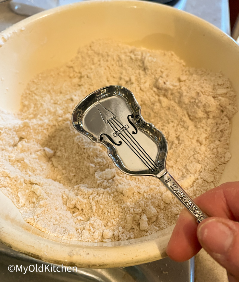 - First, mix your dry ingredients together, then cut in the cold butter. Try not to over-handle it, because the butter should stay as cold as possible for ultimate flakiness. Use a pastry cutter to mix most of it, but then crumble it into fine crumbs in your fingers at the end. Pack the mixture flat into the bowl and use a knife to divide it exactly in half–for top and bottom crust.